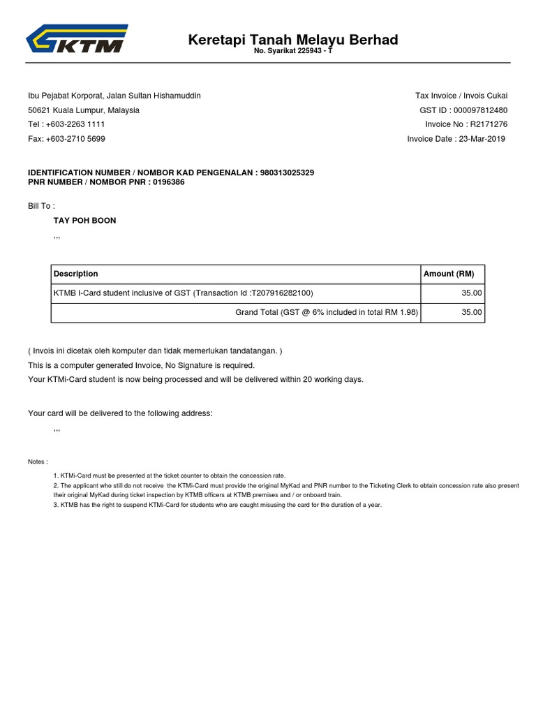 More The Identity Card KTMB. Purchase of concession ticket can be made at KTMB counter or via E-Ticket. Passport expiry date Gender I have read and agree to the Privacy Policy.